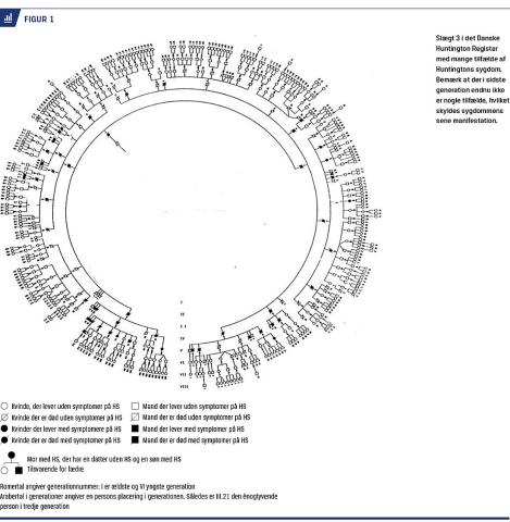 Sygdommen er sjælden, prævalensen i Danmark er 5,8 pr. 100.000, og man har kendskab til 338 nulevende personer med HS [2]. De implicerede familier er registreret i Det Danske Huntingtonregister, som rummer oplysninger om ca. 14.500 personer fra 12 generationer [2] (Figur 1). Registret vedligeholdes af Afdeling for Neurogenetik på Københavns Universitet.
