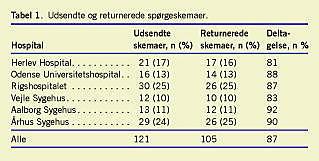I alt returnerede 105 af de 121 yngre læger et besvaret spørgeskema, hvilket giver en deltagelse på 87% (Tabel 1 ). Blandt 103 respondenter, som havde oplyst køn, var 64% kvinder og 36% mænd. Besvarelsesprocenten var lidt højere blandt mænd (88) end blandt kvinder (84). Reservelæger udgjorde 59% af respondenterne, mens 1. reservelæger og afdelingslæger udgjorde henholdsvis 17% og 24%. Tre oplyste ikke stillings- kategori.