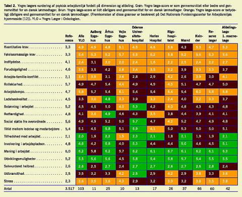 Kvantitative resultater fra 103 af 105 returnerede spørgeskemaer indgik i analysen (to spørgeskemaer var mangelfuldt udfyldt). Tabel 2 viser gennemsnitsværdier for de enkelte spørgsmål for referencegruppen af danske lønmodtagere, for de yngre læger totalt og for yngre læger på de enkelte afdelinger. Endvidere fremgår fordelingen på køn og ansættelsestype. Figuren er farvekodet for overskuelighedens skyld. For gruppen af yngre læger i onkologien oplevedes de kvantitative og følelsesmæssige krav, graden af indflydelse og forudsigelighed i arbejdet, omfanget af arbejde-familie-konflikt og krav til arbejdstempoet værre end for gennemsnittet af danske lønmodtagere. Tilfredshed med samt involvering og mening i arbejdet var mindst lige så god som gennemsnitsdanskerens. Gennemsnit for den samlede yngre læge-gruppe var signifikant dårligere end for referencegruppen (p < 0,0001) for variablerne kvantitative krav, følelsesmæssige krav, indflydelse og forudsigelighed i arbejdet, arbejdstempo, rolleklarhed, ledelseskvalitet og social støtte fra overordnede, belønning i arbejdet og oplevelsen af retfærdighed, graden af arbejde-familie-konflikt samt følelsen af stress og udbrændthed, mens variablen udviklingsmuligheder var grænsesignifikant bedre (p = 0,01), og tillid mellem ledelsen og medarbejderne var grænsesignifikant dårligere (p = 0,02). Hvad angår variablerne mening i arbejdet, involvering i arbejdspladsen og tilfredshed med arbejdet adskilte de yngre læger sig ikke statistisk fra referencegruppen. Man fandt betydende forskelle afdelingerne imellem. Således vurderedes det psykiske arbejdsmiljø mest positivt af yngre læger på Århus Sygehus og Odense Universitetshospital og mest negativt på Vejle Sygehus og på Rigshospitalet. Sammenfaldende hermed lå andelen af yngre læger, som ikke ønskede at fortsætte inden for klinisk onkologi, højest på Rigshospitalet (15%) og på Vejle Sygehus (20%). Det var endvidere på disse hospitaler, der var størst utilfredshed med introduktionen til specialet (data ikke vist). De yngre lægers tilfredshed med arbejdet lå tæt på landsgennemsnittet med størst tilfredshed blandt de ansatte på Odense Universitetshospital, Herlev Hospital og Århus Sygehus. Generelt oplevede kvindelige læger det psykiske arbejdsmiljø som mere belastende og utilfredsstillende, end deres mandlige kolleger gjorde. Kvantitative og følelsesmæssige krav og arbejds-familie-konflikt oplevedes som mere belastende af 1. reservelæger og afdelingslæger end af reservelæger, mens de vurderede de øvrige organisatoriske aspekter af arbejdsmiljøet mere positivt og var mere tilfredse med arbejdet. Ingen rapporterede om oplevelser med sexchikane, mobning, trusler om eller udsættelse for fysisk vold. De yngre lægers vurdering af eget helbred lå på niveau med landsgennemsnittet for lønmodtagere. Graden af udbrændthed lå generelt lidt højere undtagen for yngre læger på Rigshospitalet og på Vejle Sygehus, hvor den lå betydelig højere. Derimod oplevede alle respondenter, at de var signifikant mere stressede end landsgennemsnittet. Det laveste stressniveau var på Odense Universitetshospital og Herlev Hospital. Kvinder oplevede mere stress og udbrændthed end mænd, mens 1. reservelæger og afdelingslæger følte sig mere udbrændte end reservelæger.