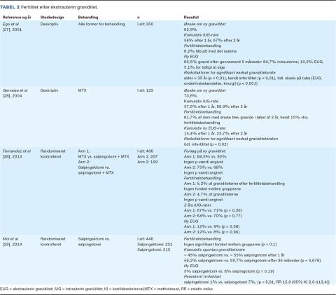 Artikler om fertilitet efter EUG er præsenteret i Tabel 2. I to deskriptive studier så man et ønske om ny graviditet hos 62,9-73,8% af patienterne. Den kumulative intrauterine graviditetsrate efter et år lå på 56-57,5% og efter to år på 67%. Hos 10,2-23,7% opstod en gentagen EUG. Andelen af kvinder, som modtog fertilitetsbehandling, var 6,2-15%. De signifikante risikofaktorer for en nedsat graviditetsrate blev fundet til at være alder > 35 år, kendt infertilitet og tidligere tubaskade [27, 28]. I to RCT’er, hvor der blev sammenlignet fertilitet efter forskellige behandlinger for EUG (medicinsk vs. kirurgisk samt konservativ vs. radikal kirurgisk), fandtes et ønske om ny graviditet hos 68-92%. Den kumulative intrauterine graviditetsrate efter to år lå på 45-71%. Hos 5-12% opstod der en ny EUG, mens 4,7-5,2% af kvinderne modtog fertilitetsbehandling. Man fandt ingen forskel på de forskellige behandlingsmåder i forhold til intrauterin graviditetsrate, ny EUG eller fertilitetsbehandling [29, 30].