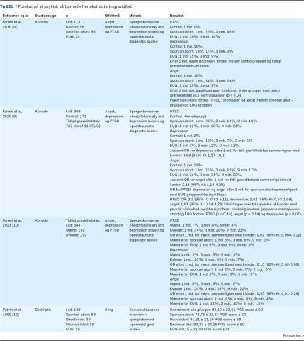 Forekomsten af psykisk sårbarhed blev beskrevet i seks studier og er præsenteret i Tabel 1. To kohortestudier af Farren et al viste ved spørgeskemaundersøgelser, at der var øget forekomst af PTSD, angst og depression hos kvinder efter tidligt graviditetstab (spontan abort og EUG) sammenlignet med en kontrolgruppe med igangværende graviditeter [8, 9]. I studierne fandt man ingen signifikant forskel i forekomsten af psykisk sårbarhed efter EUG sammenlignet med efter spontan abort efter hhv. en, tre og ni mdr. I et tredje kohortestudie af Farren et al fandt man signifikant højere forekomst af PTSD, depression og angst en, tre og ni mdr. efter tidligt graviditetstab hos kvinder end hos deres partnere [10]. Der blev påvist et højere niveau af psykisk sårbarhed blandt partnerne efter EUG end hos partnerne efter spontan abort. Dog blev det ikke angivet, om forskellene var statistisk signifikante. I et tværsnitsstudie var der ingen signifikant forskel i perinatal grief score, en skala for sorgreaktionen, mellem grupperne efter hhv. mola, spontan abort og EUG [11]. Der blev efter EUG set et signifikant højere niveau af sorg i en subgruppe af kvinder, som ikke havde børn, end hos kvinder, der havde børn [11]. I et deskriptivt studie blev det beskrevet, at patienter med EUG scorede højere i perinatal grief score end patienter efter spontan abort, men lavere end efter dødfødsel eller neonatal død, uden at det blev angivet, om forskellen var statistisk signifikant [12]. Niveauet af angst hos kvinder, som var henvist pga. abdominale smerter eller vaginal blødning i løbet af første trimester, blev undersøgt i et kohortestudie, lige inden og lige efter UL-undersøgelse samt efter 2-3 dage [13]. Diagnosen EUG resulterede i et signifikant øget niveau af angst sammenlignet med kvinder, der havde en ikkelevedygtig intrauterin graviditet. Sidstnævnte havde et signifikant øget niveau af angst sammenlignet med kvinder med en levende intrauterin graviditet. Der var ingen forskel i angst mellem kvinder med EUG og kvinder, som fik en usikker diagnose, dvs. hvor levedygtigheden eller lokalisationen af graviditeten ikke kunne bedømmes. I løbet af de første tre døgn efter undersøgelsen faldt angstniveauet i grupperne med levende intrauteringraviditet, ikkelevedygtig intrauteringraviditet samt EUG, men niveauet af angst var vedvarende signifikant højere hos patienter med EUG end i de to andre grupper. Kvinder med usikre diagnoser forblev vedvarende angste.