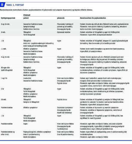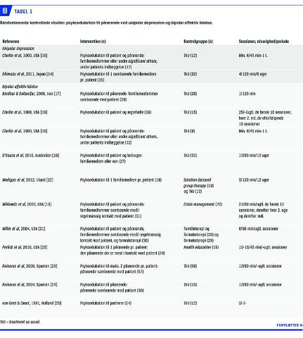 inkluderede man patienter, der var indlagt i sygdommens akutte fase [17], mens man i andre studier inkluderede stemningsneutrale patienter [18, 24]. Vigtigt er også, at der blev anvendt psykoedukationsprogrammer, som var forskellige både i indhold og længde [10]. Desuden anvendtes forskellige former for kontrolgrupper. I nogle studier blev interventionen sammenlignet med TAU [16-18, 20, 24, 25] og i andre med en anden form for familieintervention [19, 21-23]. Dette er vigtigt at bemærke, da den psykoedukative familieintervention ikke i alle tilfælde synes at være mere effektiv end andre former familiebaseret intervention [22].