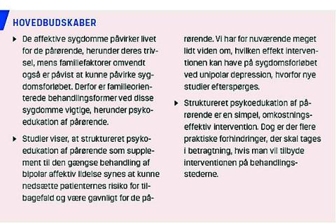 Psykoedukativ familieintervention er allerede en velbeskrevet og evidensbaseret praksis i behandlingen af skizofreni [2]. Rationalet for at anvende en lignende behandling, hvor man inddrager de pårørende, også til patienter med affektive lidelser er underbygget af flere studier. For det første er familiefaktorer påvist at kunne påvirke sygdomsforløbet af den affektive lidelse. Det er beskrevet, at en fjendtlig, kritisk eller overinvolverende holdning hos de pårørende, benævnt high expressed emotion, er associeret med øget risiko for tilbagefald for patienterne [3]. Endvidere er de pårørendes viden om den psykiske lidelse påvist at være associeret til patienternes risiko for indlæggelse [4].