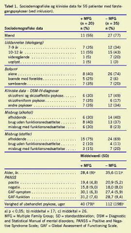 Patienterne blev inkluderet i perioden fra den 1. januar 1997 til den 31. december 2000. Alderskriterierne for inklusion var 18-65 år, diagnostisk omfattede det patienter med nydebuterede, ikkeaffektive psykoser inden for Diagnostic and Sta-tistical Manual of mental disorders (DSM)-IV skizofreniområdet (295.xx), affektive lidelser med stemningsinkongruente psykotiske symptomer (296.x4), paranoide psykoser (297.10), kortvarige psykoser (298.80) og uspecificerede psykoser (298.90). Patienterne havde ikke tidligere været i adækvat behandling for psykose. Patienterne blev inkluderet efter diagnostisk udredning med Structured Clinical Interview for DSM-IV Axis I Disorders (SCID)-interview. Psykosekriteriet og opfyldelse af sygdomsgrad blev defineret og vurderet ved hjælp af Positive and Negative Syndrome Scale (PANSS). Patienterne blev defineret som værende psykotiske ved en PANSS-score på 4 eller derover på mindst en af følgende subskalaer: P1 (vrangforestillinger), P3 (hallucinationer), P5 (storhedsforestillinger), P6 (forfølgelsesforestillinger) eller A9 (usædvanligt tankeindhold). Social funktion blev vurderet ved hjælp af Global Assessment of Functioning Scale (GAF). Inklusion forudsatte endvidere: at psykosen ikke var stofudløst, at patienten havde en IQ > 70, at der ingen kendt organisk lidelse var som årsag til psykosen, at der ikke var nogen kontraindikationer over for antipsykotisk medikamentel behandling, at patienten forstod og talte dansk, at patienten aldrig tidligere var behandlet med antipsykotisk medicin i relevant dosis (3,5 mg haloperidolækvivalent), at patienten var villig til og havde mulighed for at give informeret samtykke. Alle ratinger blev foretaget af erfarne speciallæger i psykiatri. Reliabiliteten af vurderingerne afprøvet gennem samratings blev fundet tilfredsstillende [14].