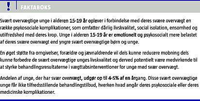 Unge, der er i alderen 15-19 år og har svær overvægt, er en udsat gruppe, hvad angår de psykosociale konsekvenser af deres vægt [1]. De psykosociale konsekvenser kan have en negativ indflydelse på deres identitetsudvikling [2]. Denne gruppe er oftere belastet af en baggrund, hvor der udøves en ringere omsorg, end andre unge får, inklusive decideret omsorgssvigt og seksuelle overgreb, som yderligere forværrer de unges psykosociale problemer.