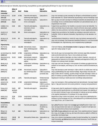 I denne oversigtsartikel gennemgås den videnskabelige litteratur om gruppen af 15-19-årige unge, der har svær overvægt, i forhold til de psykosociale problemer og de konsekvenser, som den svære overvægt er associeret med. De psykosociale problemer og konsekvenserne beskrives ud fra de unges beretninger om livskvalitet, stigmatisering/mobning og kropsopfattelse.