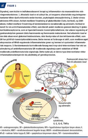 En metaanalyse fra 2017 [17] viste, at MBT kan sænke kortisolniveauet samt forbedre reguleringen af det sympatiske nervesystem og HPA. Nedregulering af NF-кB, interleukin (IL)-1B, IL-6 og IL-8 blev observeret hos personer, der var pårørende til demente og udførte MBT, og sammenholdt med en aktiv kontrolgruppe [18]. Creswell et al [19] fandt ved en firemånedersopfølgning nedsat IL-6-ekspression efter MBT ved afslappende træning. I et systematisk review [20] af 18 studier af MBT var der en generel nedregulering af gener i relation til NF-кB. Forskningen understøtter, at regulering af NF-кB-signalvejen kan være en profylaktisk mekanisme mod inflammationsrelaterede psykiske og fysiske lidelser.