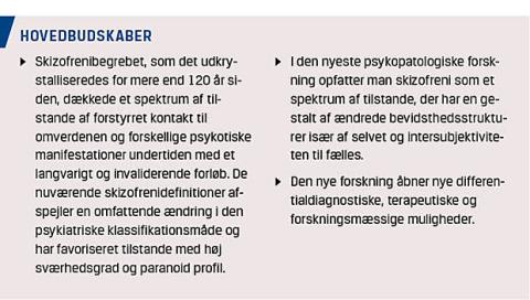 ger af hans bevidsthed) og adgang til en anden og mere ægte virkelighedsdimension (dobbeltbogholderi [28]). Genopdagelsen af selvforstyrrelser inden for skizofrenispektret afspejles i den definition af skizofreni, der er foreslået i den 11. udgave af ICD, hvor skizofreni beskrives således: »Schizophrenia is characterized by disturbances in multiple mental modalities, including thinking [...], perception [...], self-experience [...], cognition [...], volition [...] and affect [...]«. Efter forfatternes opfattelse er kendskabet til selvforstyrrelser et afgørende element i tidlig differentialdiagnostik og i den generelle forståelse af den syge. Det synes at være indlysende, at kendskabet til selvforstyrrelser i fremtiden må spille en rolle i de psykoterapeutiske tiltag og i den patogenetiske forskning [29, 30] Selvforstyrrelser som grundfænotype må ligge tættere på et potentielt neuralt substrat end de komplekse slutprodukter i den skizofrene lidelse (f.eks. hallucinationer og vrangforestillinger).