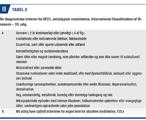stereotypier og mere subtile affektforstyrrelser) er forsvundet fra det diagnostiske billede. De såkaldte negative symptomer er et forsøg på at konvertere forskelligartede kontakt-, affekt- og udtryksforstyrrelser til simple, uspecifikke adfærdsmæssige defekter, som på engelsk signaleres af deprivative alpha (a-logia, a-volition mv.). Den indre verden hos patienter med skizofreni er ubeskrevet. Disse problemer fører til, at patienter med et mindre kronisk og mildere sygdomsbillede bliver underdiagnosticeret med en for tiden voldsom stigning i diagnoser som f.eks. borderlinepersonlighedsforstyrrelse, autisme, ADHD og OCD [12]. Der er således opstået en slags diagnostisk vakuum for patienter med nyopstået sygdom og patienter med et mildere symptombillede, hvilket har afstedkommet forskning i tidlig identifikation og intervention [13]. En potentiel mulighed for at diagnosticere de mildere skizofreniformer ved brug af ICD-10 ligger i anvendelsen af diagnosen skizotypisk sindslidelse (Tabel 2).