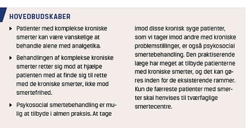 For patienter med langvarige smerter og komorbiditet i form af søvnforstyrrelser, kognitive vanskeligheder som hukommelses- og koncentrationsproblemer eller ligefrem angst og depression kan farmakologisk smertebehandling ofte ikke stå alene, og den eneste mulighed for at hjælpe patienten vil være gennem psykosocial behandling [3]. For de hårdest ramte patienter med smerter er det en specialiseret indsats i et tværfagligt smertecenter, der skal til, men langt størstedelen af patienterne kan behandles i almen praksis. For selv om mange konsultationer i almen praksis er korte, er det bestemt muligt at tilbyde sine patienter psykosocial behandling.