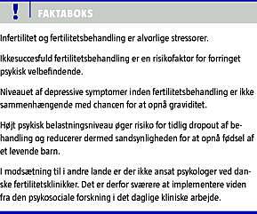 Summary The psychosocial consequences of infertility and fertility treatment Ugeskr Læger 2012;174(41):2459-2462 Infertility and its treatment are severe, chronic, low-control stressors. Among women unsuccessful treatment is associated with increased risk of developing depressive symptoms. Among men infertility is associated with more negative emotional responses. Lifelong involuntary childlessness is associated with reduced mental well-being. It is recommended in the future to integrate mental health professionals at fertility clinics in Denmark in order to secure that also the psychosocial consequences of infertility and fertility treatment are taken care of with the highest professional standard based on scientific knowledge within this field.