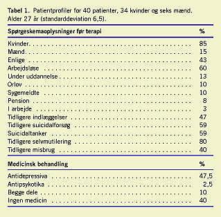Resultater: Fyrre patienter, heraf 34 kvinder, fuldførte behandlingen, otte patienter udgik, og fem patienter fik anden behandling. Gennemsnitsalderen var 27 år. 40% var tidligere misbrugere, og 80% havde parasuicidal adfærd. Den hyppigste diagnose var borderline- forstyrrelse, som blev fundet hos 63%. Der var komorbiditet med angsttilstande hos 48% og depression hos 22%. Vigtigst blev der efter dagbehandlingen fundet en signifikant symptomreduktion, en signifikant stigning i funktionsniveau, en reduktion i selvdestruktiv adfærd, et markant fald i antal indlæggelser og skadestuebesøg og en relativt stor tilfredshed med behandlingen.