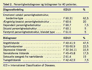Hovedparten (62,5%) led af en borderline- personlighedsforstyrrelse (Tabel 2 ) efter DSM-IV (ICD-10; emotionelt ustabil personlighedsstruktur, borderline- type). Der blev fundet komorbiditet med affektive lidelser i form af angst (48%), depression (22%), spiseforstyrrelser (22%), somatoforme lidelser (18%) og tvangslidelser (8%). 15% havde været udsat for seksuelle overgreb.