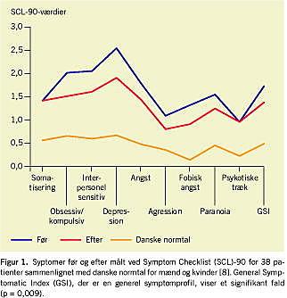 Som vigtigste resultater blev der fundet en signifikant reduktion på globale mål for symptomer målt ved SCL-90-R (general symptomatic index (GSI), p = 0,009) (Figur 1 ) og ved GAF-bedømmelse en signifikant (p = 0,000) stigning i funktionsniveau GAF/f før 42 (SD = 5,9) til GAF/f efter 48 (SD = 8,0) og fald i symptomer fra GAF/s før 45 (SD = 6,5) til GAF/s efter 51 (SD = 7,8).