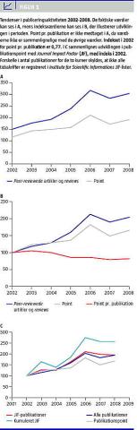 Figur 1C viser desuden, at udviklingen i publikationspoint og kumuleret JIF udviser samme trend, men ikke er ensartet. Der forekommer især store forandringer i JIF, hvilket kan tilskrives nogle få publikationer i tidsskrifter med meget høj JIF. Værdierne i JIF-kurverne er altså i langt højere grad afhængige af nogle få publikationer end de publikationspoint, der er beregnet via den norske model.