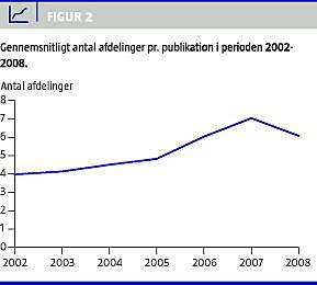 En opgørelse af antallet af afdelinger, der har deltaget i produktionen (interne såvel som eksterne) - opgjort på baggrund af forfatteres adresseangivelser - indikerer, at der i perioden er en støt stigning (Figur 2 ) på trods af et fald i 2008. Selv om der her er tale om gennemsnitsværdier, der ikke siger meget om fordelingen, viser de en tydelig tendens. Samtidig er udviklingen i publiceringen på de forskellige pointniveauer stort set stabil over hele perioden (Figur 3 ). Udviklingen i point pr. publikation ser dermed ud til i højere grad at skyldes et øget antal deltagende institutioner end en forringelse i valg af publiceringskanal.