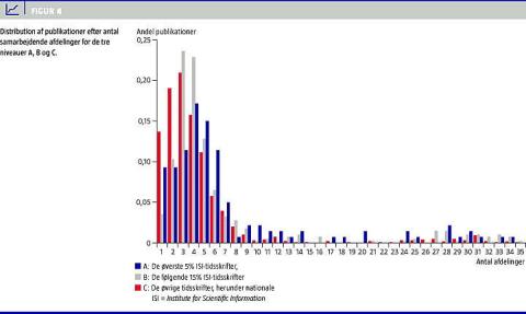 Figur 4 antyder, at der på niveau A deltager flere afdelinger end for de to andre niveauer. For med sikkerhed at kunne afgøre dette, er alle niveauerne parvis blevet sammenlignet. Distributionerne ligner Poissonfordelinger, og er altså ikke normalfordelte, hvorfor der anvendes Mann-Whitney U-test, med en nulhypotese om, at forskelle i fordelingen af stikprøverne ikke kan tilskrives statistiske tilfældigheder. Sammenligningerne har resulteret i p-værdierne p (A, C) = 0,000 p (B, C) = 0,000 og p (A, B) = 0,539. Med en signifikansgrænse på 0,05 forkastes nulhypotesen derfor i tilfældene (A, C) og (B, C) hvilket vil sige, at niveau A og B er signifikant forskellige fra niveau C i deres fordeling. Medianen for A og B er fire, mens den for C er tre. Det ses også af Figur 4, at A og B rimelig tydeligt har flere afdelinger pr. publikation. Da der ikke er nogen signifikant forskel på A og B, er konklusionen, at der deltager flere afdelinger pr. publikation på kvalitetsniveauer over C, end der gør på niveau C.