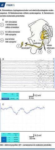 Der blev udført somatosensoriske evokerede potentialer (SEP) af n. pudendus efter elektrisk stimulation af penis og registrering kortikalt, bulbokavernøs refleksundersøgelse (BCR) med elektrisk stimulation af penis og registrering fra m. bulbocavernosus samt elektromyografisk (EMG) undersøgelse af mm. bulbocavernosi og spinchter ani externus (Figur 1A). BCR viste normal latens på venstre side og forlænget latens på højre side (Figur 1B). SEP af n. pudendus (Figur 1C)