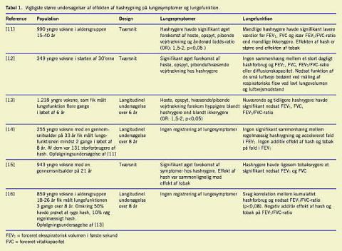 Resultater vedrørende kroniske effekter af hashrygning på lungefunktionsmål, såsom forceret eksspiratorisk volumen i 1. sekund (FEV1 ), forceret vitalkapacitet (FVC) og diffusionskapacitet er noget divergerende. I en af de større undersøgelser kunne forfatterne påvise, at mariuanarygning var korreleret til signifikant nedsat FEV1 /FVC- og FEV1 -niveau [11]. I opfølgningsundersøgelsen af denne amerikanske kohorte observerede man et accelereret fald i FEV1 - det vil sige fund, som tyder på, at hashrygning kan være en risikofaktor for udvikling af kronisk obstruktiv lungesygdom (KOL) [13]. I en otteårs longitudinel undersøgelse af 1.037 yngre voksne rygere kunne Taylor et al påvise et faldende FEV1 /VC-ratio med stigende cannabisforbrug. Påvirkningen fra cannabis var dog mindre udtalt end effekten af tobak, men forfatterne kunne påvise en additiv effekt af begge substanser [16].