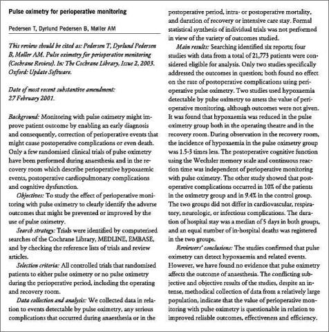 I det følgende gennemgås et Cochrane-review, hvor den reelle effekt af perioperativ overvågning med pulsoksimetri søges beskrevet. Herunder søges samtidig at få uhensigtsmæssige hændelser, som kunne tænkes forebygget eller formindsket ved brug af pulsoksimetri, identificeret. Følgende hypotese blev testet: Brug af pulsoksimetri er forbundet med forbedret opdagelse af - og dermed behandling af - hypoksæmi, og brug af pulsoksimetri per se reducerer såvel morbiditet som mortalitet perioperativt [5].