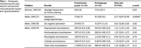 I et andet og større studie, der inkluderede 20.802 patienter, fandt man postoperative komplikationer hos 10% af patienterne i pulsoksimetrigruppen og hos 9,4% af patienterne i kontrolgruppen [9]. Varigheden af hospitalsophold var i begge grupper fem dage. Også her var det ikke muligt at dokumentere, at brug af pulsoksimetri reducerede den samlede hyppighed af postoperative komplikationer.
