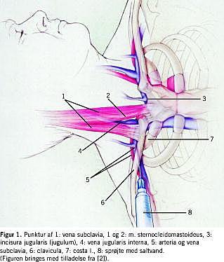 Indstiksnålen forsynet med 10 ml-sprøjten fyldt halvt med saltvand indføres samme sted som tidligere anvendt, hvor nålen indføres under kravebenet og langs denne i retnings af et punkt mellem isthmus thyroidea og jugulum under samtidig undertryk i sprøjten, og 3-7 cm inde er venen fundet. Såfremt der er lavt venefylde, findes venen først, når nålen trækk es langsomt tilbage under stadigt undertryk.