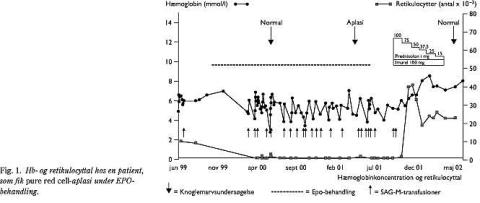 En 62-årig mand blev indlagt i juni 1999 med diagnoserne anæmi og diabetisk nefropati. Patienten havde haft type 1-diabetes mellitus siden 1977. Hb var på 6,5 mmol/l, middelcellevolumen på 86, retikulocyttal på 10 × 10-3 /l, leukocyttal på 6,9 × 10 9 /l, trombocyttal på 302 × 10 9 /l, kreatinin på 397 μ mol/l og carbamid på 33,7 mmol/l. Patienten blev i juli 1999 henvist til nefrologisk afdeling mhp. dialyse. I september 1999 påbegyndtes behandling med EPO (epoetin alfa), 2.000 IE × 1/uge, hvilket initialt medførte en stigning i Hb fra 6,1 til 7,0 mmol/l (Fig. 1 ). Efterfølgende faldt Hb, og patienten var i marts og april 2000 indlagt til optransfundering pga. svær anæmi med Hb på henholdsvis 4,9 og 4,2 mmol/l. Pga. stigende nyreparametre påbegyndtes der peritonealdialyse i april 2000, og EPO-behandlingen blev øget til 4.000 IE × 2/uge. En knoglemarvsundersøgelse på dette tidspunkt viste normale forhold. EPO-dosissen blev yderligere øget til 10.000 IE × 3/uge, og der var alligevel behov for blodtransfusion i gennemsnit hver 3.-4. uge. Efter oprettelse af dialyseafsnit blev patienten hjemtaget til videre kontrol på lokalt sygehus i september 2000. Der var vedvarende retikulocytopeni på 0-1 × 10 -3 , og en ny knoglemarvsundersøgelse efter 20 måneders EPO-behandling viste pure red cell- aplasi, idet der var manglende erytropoiese i en jernrig knoglemarv med livlig myelopoiese. Antistofundersøgelse for Hepatitis B- og C-virus, Cytomegalovirus, Epstein-Barr virus samt parvovirus B19 var alle negative. Paroksystisk natlig hæmoglobinuri blev udelukket ved flowcytometrisk undersøgelse. Ved CT af thorax blev der ikke påvist tymom. EPO-behandlingen blev herefter seponeret, og i oktober 2001 påbegyndtes immunosupprimerende behandling med tbl. azathioprin 100 mg daglig og tbl. prednisolon 100 mg daglig. Under denne behandling blev der hurtigt registreret retikulocytose, og Hb steg over fire måneder fra 5,2 mmol/l til 8,6 mmol/l under prednisolonaftrapning til 15 mg daglig (Fig. 1). I forbindelse med pneumoni har der forbigående været Hb-fald til 7,2 mmol/l, men der er fortsat retikulocytose på 23-26 × 10 -3 . En knoglemarvsundersøgelse efter knap syv måneders immunosupprimerende behandling viste normoblastær erytropoiese, hvor den erytroide cellepopulation udgjorde 50% af det hæmatopoietiske væv. Der er ikke undersøgt for EPO-antistoffer i aplasiperioden, og efterfølgende er der ikke påvist EPO-antistoffer.