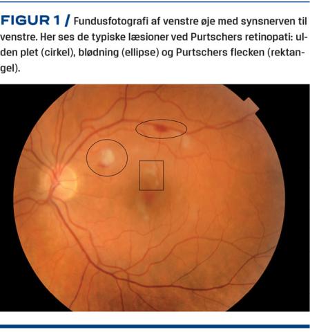 Purtschers retinopati (PR) er morfologiske og anatomiske forandringer i øjets nethinde forårsaget af fedtembolier, der er frigivet fra en skadet knogle, hvilket medfører okklusion af de prækapillære arterioler. Forandringerne består af blødninger i moderat antal (65%), uldne pletter (93%) og Purtschers flecken (PF) (63%). PF anses som patognomonisk for tilstanden og ses som perivaskulære afblegede polygonale områder forårsaget af iskæmi (Figur 1). Synsfunktionen kan blive påvirket af dels iskæmien og atrofi ved den indre retina, dels de morfologiske læsioner, der skygger over nethinden, hvilket kan involvere centralsynet [1].