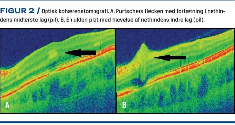 PR er en sjælden komplikation. Tilstanden opdages som oftest pga. synsforstyrrelser opstået 24-48 timer efter et traume eller kirurgi. Oftalmologisk undersøgelse vil som oftest vise typiske morfologiske forandringer i form af retinale blødninger, uldne pletter og PF (Figur 2). Omkring hver femte vil opleve total remission efter et år med konservativ behandling, men der er risiko for varig synsnedsættelse og synsfeltsdefekter. Patienter, der har synsnedsættelse efter et traume eller kirurgi, bør henvises til en øjenspecialist snarest for korrekt diagnose.