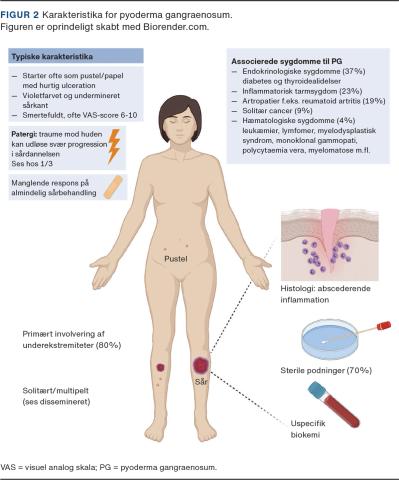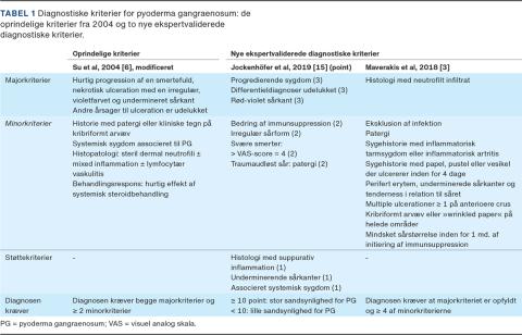 Pyoderma gangraenosum (PG) er en alvorlig inflammatorisk hudsygdom, der er karakteriseret ved smertefuld sårdannelse. Sårene har typisk violetfarvede sårkanter og vokser sig hurtigt større [1-4]. Selvom PG er sjælden med en incidens på seks nye tilfælde pr. 1 mio. indbyggere [5], er det en vigtig differentialdiagnose til f.eks. nekrotiserende fasciitis, vaskulitis, Martorells sår og cancersår. I svære tilfælde kan ubehandlet PG vokse med flere centimeter om dagen og give anledning til svær sygelighed samt medføre død [6, 7].