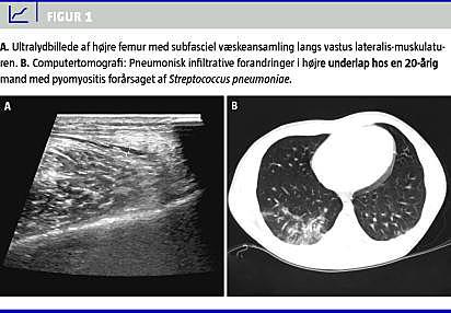 Summary Pyomyositis caused by Streptococcus pneumoniae in a previously healthy 20 year-old man Ugeskr Læger 2012;174(40):2390-2391 Pyomyositis is a bacterial infection of the skeletal muscle usually caused by Staphylococcus aureus . This case report presents a 20 year-old man with pyomyositis caused by Streptococcus pneumoniae. Pyomyositis is a rare but potentially critical disease, and early diagnosis, drainage and use of appropriate antibiotic therapy are essential to reduce morbidity and mortality. However, early diagnosis of pyomyositis can be challenging as initial symptoms may be vague, but the condition should be suspected in patients with acute onset of severe, localised muscle pain and fever.