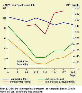 Efter 15 ugers behandling ophørte patienten med at spise. Biokemi viste leukopeni (2,2 ×109/l), neutrofil granulocytopeni (0,9 ×109/l), trombocytopeni (114 ×109/l) og normal hæmoglobin (9,4 mmol/l). Knoglemarvsbiopsi viste normale forhold. Quetiapin blev seponeret, og patienten fortsatte den øvrige behandling. En uge senere var der stigning i leukocytter, neutrofile granulocytter og trombocytter, og efter to uger var der normal hæmatologi (Figur 1).