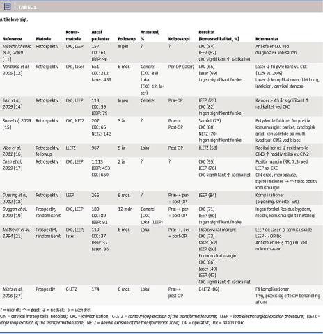 58-95. CKC tenderer til lidt højere radikalitet, men er til gengæld præget af flere komplikationer i form af blødning, infektion og cervikal stenose. Laserkonisation anbefales ikke, da den er teknisk svær, kostbar og har højere forekomst af termiske skader på konuspræparatet. Globalt er LEEP den mest anvendte og anbefalede konisationsmetode. LEEP har høj radikalitet, er tidsbesparende i operationstid og kan udføres i lokalanæstesi, hvilket gør metoden økonomisk, da operationen kan udføres i dagkirurgisk regi. LEEP er dog kompliceret af højere frekvens af termiske koagulationsskader. I situationer med invasiv cancer, hvor frie resektionsrande og histologisk fortolkning af konus er diagnostisk for sekundær operationsmetode, anbefales CKC. Anæstesimetode synes ikke at have indflydelse på radikaliteten ved konisationsbehandling for CIN. Randomiserede studier, hvor man har undersøgt værdien af peroperativ kolposkopi og sammenhængen mellem operatørens erfaring og radikaliteten af konisationen, er nødvendige, for at man kan drage en konklusion.