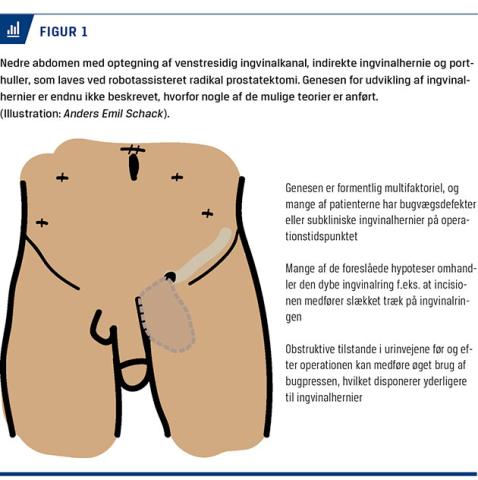 Prostatacancer er den hyppigste cancerform hos mænd med 4.500 nydiagnosticerede tilfælde årligt i Danmark [1]. Ved lokaliseret prostatacancer tilbydes kurativt intenderet behandling med radikal prostatektomi. I Danmark udføres der ca. 1.200 radikale prostatektomier årligt, hvoraf 97% udføres robotassisteret [2, 3]. De to hyppigste komplikationer efter radikal prostatektomi er urininkontinens og impotens [4], men der har i de seneste 20 år været et øget fokus på ingvinalhernier som en overset postoperativ komplikation. I et systematisk review og metaanalyse blev incidensen af ingvinalhernier opgjort til 16% efter åben retropubisk radikal prostatektomi og 7% efter laparoskopisk radikal prostatektomi [5]. Så vidt vi ved, er denne problemstilling ikke blevet behandlet før i dansk litteratur.