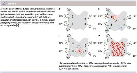 Lone atrial fibrillation, hvor man ikke kan finde oplagte disponerende faktorer, ses ofte hos yngre personer. Til trods for intensiv forskning i mekanismerne bag AF er disse ikke fuldt klarlagt. Multiple random propagating wavelets, focal electrical discharges og localized re-entrant activity with fibrillatory conduction menes dog at være de centrale elementer (Figur 1). Disse teorier er baseret på, at AF kræver både trigger-foci til initiering og et substrat til vedligeholdelse. Ved paroksystisk AF er over 94% af disse trigger-foci lokaliseret i overgangszonerne omkring pulmonalvenernes (PV) indmunding i VA. Ved fremskreden AF er disse dog ofte mere spredt og kan findes i andre områder af VA og i højre atrium (HA) [10]. Strukturel hjertesygdom faciliterer en langsom, men fremadskridende remodellering af hjertevævet og dermed omdannelse af fibroblaster til myofibroblaster [1] samt øget dannelse af bindevæv og fibrose. Denne elektriske remodellering faciliterer både initiering og vedligeholdelse af AF [1, 9, 11].