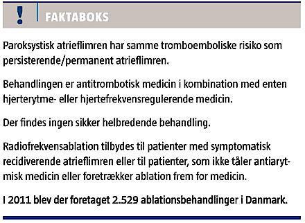 hjertesygdom, anbefales AAD som førstevalg, mens RFA kan overvejes. Dog er sandsynligheden for succes mindre. Rationalet for eliminering af AF med RFA inkluderer en potentiel forbedring af livskvalitet, nedsat risiko for apopleksi og hjertesvigt samt forbedret overlevelse [9]. I flere randomiserede kliniske studier har RFA vist sig at være mere effektiv end AAD til opnåelse af stabil SR efter et års opfølgning (66-86% vs. 16-58%) [9]. I en metaanalyse fra 2010 inkluderede man otte randomiserede kliniske forsøg og fandt, at efter 12 måneders opfølgning var 76,8% mod 23,4% uden AF-recidiv ved hhv. RFA- og AAD-behandling. Der blev rapporteret om komplikationer og adverse event hos 9% i RFA-grupperne og 13% hos AAD-grupperne [18]. I MANTRA-PAFstudiet har man påvist, at RFA reducerer AF-byrden og forekomsten af symptomatisk AF mere efter to års opfølgning, end AAD gør [19]. Selvom RFA-proceduren har været brugt siden slutningen af 1990’erne, er der sparsomme data om langtidsresultater. I enkelte studier har man dog fundet, at blandt patienter, der var fri for AF efter et år, oplevede < 10% tilbagefald efter yderligere 2-3 års opfølgning. Efter fem års opfølgning var tilbagefaldsraten 25,5% med størst tendens hos patienter, der havde anden hjertesygdom [9].