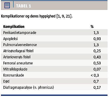 Den rapporterede komplikationsrate ved RFA undersøgt ved hjælp af spørgeskemaer er 4,5% [20]. Kendte komplikationer og deres hyppighed er gengivet i Tabel 1. Det skal dog tilføjes, at der ikke er observeret atrioøsofageal fistel i Danmark, og der er kun observeret ganske få tilfælde af PV-stenose, da man forsøger at ablatere i god afstand fra PV-ostia. Apopleksirisikoen er også lav i Danmark (1-2‰).
