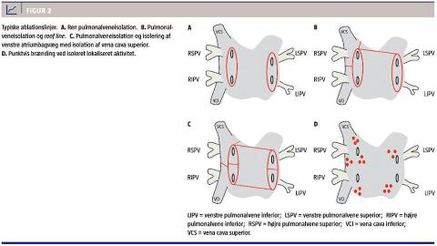Brug af RFA hos patienter med AF stiler mod at forhindre hurtig udbredelse af elektriske impulser fra trigger-foci i PV og/eller udbredelse af disse ved anlæggelse af ablationslinjer i VA/HA. Der anvendes forskellige metoder til opnåelse af dette. Den mest anvendte er anlæggelse af endokardielle ablationslinjer ved RFA. Det anbefales som minimum, at patienter med persisterende AF skal være i behandling med warfarin i tre uger før RFA med international normaliseringsratio på 2-3. Ved AF > 48 timer eller ukendt varighed og ingen foregående AK-behandling skal der som minimum udføres transøsofageal ekkokardiografi < 48 timer før RFA [9, 12]. Brugen af antitrombotisk behandling forud for RFA vurderes individuelt, men der tages udgangspunkt i Dansk Cardiologisk Selskabs trombokardiologirapport [12]. Præoperativ computertomografi eller MR-skanning af hjertet bruges til kortlægning af hjertets anatomi og specielt VA og PV. Ablation foregår under lettere sedation eller i fuld anæstesi [9]. Der indføres flere katetre via v. femoralis til HA, og under røntgengennemlysning foretages der transseptal atrialpunktur efterfulgt af heparinisering. Der foretages kortlægning af VA, hvor man ved hjælp af speciel software (CARTO/NAVx) danner et tredimensionelt billede af VA’s og PV’s indmundinger. Elektroder på kateterspidsen transmitterer radiofrekvensenergi til vævet, hvorved der dannes ablationslinjer. Der findes flere forskellige slags katetre med forskellige modaliteter til afgivelse af radiofrekvensenergi. Ved paroksystisk AF ablateres der rundt om PV’s indmundinger. Ved mere fremskreden AF, hvor der er sket en remodellering af VA, kan der desuden anlægges lineære ablationslinjer i selve VA for at hindre wavefronts-udbredelsen (Figur 2). Områder med complex fractionated atrial electrogrammes har også været mål for AF-ablation. Disse områder med fraktionerede potentialer og meget kort cykluslængde har tæt tilknytning til ganglier fra det autonome nervesystem. Ganglierne er specielt lokaliseret fire steder i det epikardielle fedtlag på VA. De findes ved endokardial høj frekvensstimulation og ablateres, indtil der ikke længere er respons ved stimulation [9]. ###