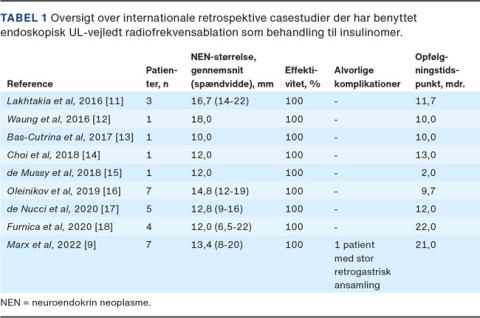 De internationale erfaringer med EUL-RFA af insulinomer er sparsomme, og evidensen udgøres af ganske få retrospektive caseserier, hvor der er risiko for publikationsbias, hvor negative resultater eller erfaringer med alvorlige komplikationer ikke publiceres (Tabel 1). Data fra tilgængelige studier (Tabel 1) viser, at morbiditeten og mortaliteten ved proceduren er lav. Samtidig er EUL-RFA forbundet med en høj teknisk og klinisk succes med effektiv symptomlindring i form af euglykæmi umiddelbart efter en enkelt procedure. Der er ikke beskrevet hverken endo- eller eksokrin pancreasinsufficiens efter behandlingen. Generelt er bivirkningsprofilen god, og den hyppigste komplikation ved proceduren er mild pankreatitis, som forekom hos 10%. Desuden beskrives lette øvre abdominalsmerter og feber hos 7% samt moderate abdominalsmerter hos 3,5%. Procedurerelateret blødning ses sjældent og opdages peroperativt, men behandles i langt de fleste tilfælde konservativt. Disse komplikationer beskrives alle som milde og/eller moderate, fraset et enkelt tilfælde af større retrogastrisk ansamling og død hos en ældre og svækket patient. Vedrørende klinisk respons har man hos langt hovedparten af patienterne opnået euglykæmi efter en enkelt behandling med EUL-RFA fraset hos Waung et al [12], hvor euglykæmi først blev opnået efter tredje behandling med EUL-RFA hos en enkelt patient. Den gennemsnitlige postoperative indlæggelsestid var ca. to døgn.