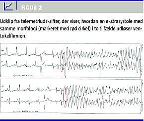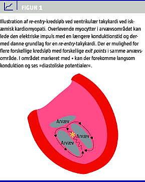 VT og VF forekommer oftest ved strukturel hjertesygdom. Typiske eksempler er iskæmisk og noniskæmisk dilateret kardiomyopati samt hypertrofisk og arytmogen højre ventrikel-kardiomyopati og efter tidligere hjerteoperationer [11]. Især ved iskæmisk kardiomyopati er mekanismen ved VT ofte re-entry -kredsløb i grænsezonen mellem arvæv og raskt myocardium og betinget af, at et arvævsområde kan have flere mulige kredsløb med forskellig konduktionsevne og refraktære perioder. Dette danner grundlag for en re-entry -takykardi evt. med adskillige exit points (Figur 1 ), som kan medføre flere forskellige VT-morfologier, der udgår fra samme område [12, 13]. VF kan udløses af præmature ventrikulære komplekser (ofte udgående fra purkinjefibre), bradykardi, VT og akut iskæmi [13, 14]. Akut iskæmi kan ligeledes udløse polymorf VT og sjældnere monomorf VT [11]. I Figur 2 vises et eksempel på VF udløst af et præmaturt ventrikulært kompleks.