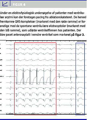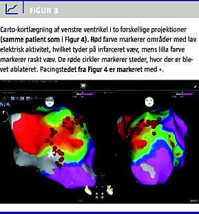 Elektromagnetisk navigation med f.eks. CARTO-systemet giver mulighed for kortlægning af ventriklernes anatomi og elektrofysiologiske egenskaber (Figur 3 ), og herved kan områder, der er kritiske for den ventrikulære arytmi, identificeres og ablateres [13]. Ablationskateteret er udstyret med elektriske poler på spidsen, hvilket muliggør, at elektriske signaler fra myokardiet kan opmåles og vurderes, og derudover kan man foretage pacing fra forskellige positioner i hjertet.