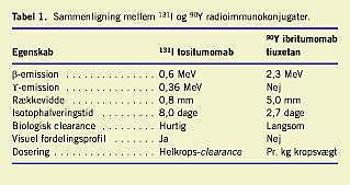 Ibritumomab er et murint IgG1-kappa-monoklonalt anti-CD20-antistof, som er det oprindelige antistof til det kimære rituximab. Antistoffet bliver ved klinisk brug bundet til en radioaktiv isotop med chelatbinderen tiuxetan, som stabiliserer den radioaktive isotops binding til antistoffet. Det er muligt at benytte 111 In-konjugeringen til dosimetri og billeddannende formål og 90Y konjugeringen til selve radioimmunoterapien. Når antistoffet er bundet til tumorcellen, deponerer radionukleotiden hovedsageligt sin energi i de omkringliggende celler, hvorved der opstår en »krydsildseffekt«, som inducerer en letal DNA-skade. 90Y afgiver kun betaemission, har en rækkevidde på 5 mm og har en halveringstid på 64 timer (Tabel 1). I kliniske undersøgelser er sikkerheden og effekten blevet vurderet i fase I/II-undersøgelser hos patienter med refraktære follikulære eller transformerede lymfomer, hvor den maksimale tolererede dosis var hhv. 0,4 mCi/kg og 0,3 mCi/kg ved trombocyttal på 100-150 mia./l. I en fase III-undersøgelse blev 90 Y ibritumomab-tiuxetan sammenlignet med rituximab hos 143 patienter med recidiverende eller refraktært follikulært lymfom [2]. Man fandt en signifikant højere responsrate på hhv. 80% og 56% og en højere andel af ibritumomab-patienterne opnåede varig (> 6 mdr.) komplet remission (CR) (30% vs. 16%). Også hos patienter, som tidligere var blevet behandlet med rituximab, er der vist effekt af RIT, hvor 54 patienter med follikulært lymfom, grad I-III, som var refraktære over for rituximab-behandling, opnåede 74% respons på ibritumomabbehandling, heraf 15% i CR [3]. I ingen af de hidtil publicerede studier har man dog kunnet påvise en øgning af over-levelsen. Bivirkningerne er primært hæmatologiske med transient udvikling af common toxicty criteria (CTC) [4] grad IV-neutropeni, trombocytopeni og anæmi på hhv. 35%, 9% og 4%. Tidspunkt for udviklingen af nadir (4-5 uger) opstod væsentlig senere end ved kemoterapi, ligesom varigheden af nadir (15-17 dage) var væsentlig længere. De ikkehæmatologiske bivirkninger var primært infusionsrelaterede med træthed (54%), kvalme (35%), kulderystelser (25%) og feber (21%).