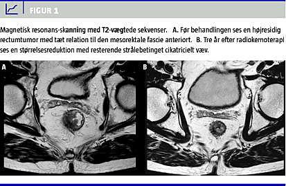 Behandlingen af T3-stadier af rectumcancer med < 5 mm til den mesorektale fascie er operation 6-8 uger efter præoperativ strålebehandling og kemoterapi. Resultaterne fra flere undersøgelser viser, at denne kombination medfører en recidivfrekvens på kun ca. 5% [1]. Patienten i vores sygehistorie udviste komplet klinisk remission, hvilket indikerer, at radiokemoterapi kan være kurativ. Undersøgelser tyder på, at op til 30% af patienterne udviser fuldstændig klinisk og patologisk remission efter radiokemoterapi, og at operation dermed kan undgås [2, 3]. Der kan dog stilles spørgsmålstegn ved kvaliteten af disse undersøgelser pga. selektionsbias, manglende præoperativ MR-skanning og usikker followup. Her i landet har et igangværende studie til hovedformål at belyse lokalrecidivfrekvensen af rectumcancer efter radiokemoterapi uden efterfølgende operation. Patienter med primær resektabel T2- eller lavtsiddende T3-tumorer, som ikke har fjernmetastaser, inkluderes. Patienter med resttumor efter radiokemoterapi henvises til operation. De øvrige patienter tilbydes observation, watchful waiting . Påvises en resttumor i kontrolforløbet, henviser man til operation. Et andet formål med studiet er at belyse, om en gruppe patienter kan skånes for et belastende kirurgisk indgreb. Mortaliteten ved operation er 5-10%, og almindeligt forekommende risici er sphincterpåvirkning med fækal inkontinens og urge samt impotens. Hertil kommer anastomoselækage [1, 3].