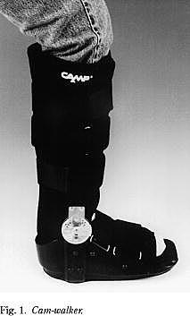 Cam-walker (Fig. 1 ) er en aftagelig, genanvendelig støvle, der påsættes med velcrobånd. Den er udstyret med et hængsel, der gør det muligt at stille ankelleddet i op til 30° spidsfod. Det primære mål var at undersøge, om letvægtsgipsen kunne erstattes med en CAM-valker uden øgning i rerupturfrekvensen. Ved at erstatte gipsen med cam-walker forventede vi desuden en større patienttilfredshed, og at den var sammenlignelig med gipsen med hensyn til resultater.