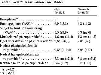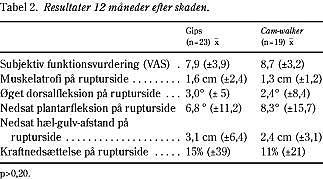 Materiale og metoder: I alt 50 patienter med førstegangs akillesseneruptur blev randomiseret til enten gips eller cam-walker. Begge grupper blev immobiliseret i otte uger. Alle patienter blev undersøgt fire og 12 måneder efter skaden.