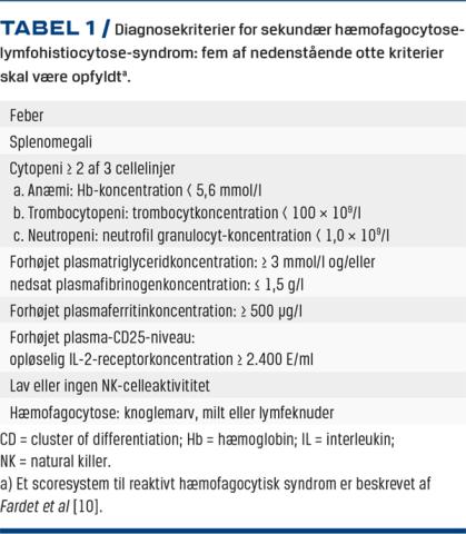 Udiagnosticeret og dermed ubehandlet virusassocieret HLS bidrager måske til den høje mortalitet ved svær COVID-19-pneumoni. Således viste et studie med kritisk syge patienter, der var i respirator under influenzapandemien i 2009, at 36% af patienterne havde komplicerende HLS, og mortaliteten i denne gruppe var 89% modsvarende 25% hos patienter uden HLS [4]. Diagnosen sekundær HLS hviler på internationale kriterier, som det fremgår af Tabel 1 [10-12]. Hos patienterne med COVID-19 vil syndromet formentlig udvikles dynamisk mod den fuldt udviklede tilstand, hvor patienterne er svært medtagne. Derfor er det vigtigt at være opmærksom på tidlige tegn på dets udvikling, herunder forhøjelse af niveauet af ferritin og triglycerider, nedsat fibrinogenniveau og udvikling af cytopeni [10, 11]. Forudsætningen for at kunne revertere tilstanden under behandling med ruxolitinib må alt andet lige formodes at være bedre ved en intervention i et tidligere stadium, end før refraktært respiratorisk svigt er manifest.