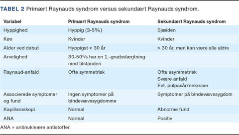 Udredningen fokuserer på at afdække sekundære årsager til RS og vurdere sværhedsgraden af tilstanden. En grundig anamnese kombineret med en klinisk undersøgelse og evt. måling af ANA vil i de fleste tilfælde være tilstrækkelig til at kunne klassificere tilstanden som primær eller sekundær (Tabel 2). Sekundært RS overvejes især ved RS debuterende efter 30-årsalderen, unilateralt RS ved involvering af tommelfingeren og ved samtidige pulpasår [1, 19]. Hånd-arm-vibrations-syndrom er generelt hyppigst blandt mænd [20].