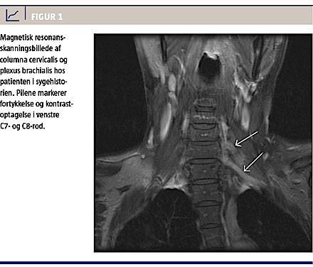 undersøgelse seks måneder senere viste kombineret motorisk og sensorisk affektion af n. ulnaris sin. og forlænget F-wave-latens i begge nerver, hvilket er foreneligt med påvirkning af den nedre del af plexus brachialis. Der blev udført magnetisk resonans