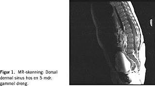 Meningitis med indgangsport gennem en dorsal dermal sinus er velbeskrevet [1-3]. Prævalensen af OSD angives at være 0,05 pr. 1.000, og i et studie beskrives meningitis med indgangsport gennem en dorsal dermal sinus som debutsymptom på OSD hos tre ud af 47 undersøgte patienter [1]. Det er karakteristisk, at der kan være tale om meningitis med et usædvanlig ætiologisk agens, herunder Staphylococcus epidermidis, og recidiverende meningitis [1, 2].