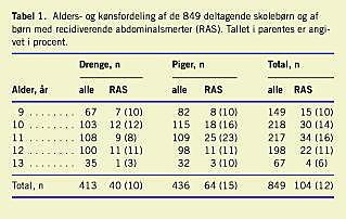 Diskussion: Prævalensen af RAS har ikke ændret sig siden Apleys klassiske undersøgelser i 1955, men flere har modtaget behandling, hvilket enten kan tilskrives større krav om behandling eller bedre behandlingstilbud. Overhyppighed blandt pigerne specielt i 11-års-alderen kan formentlig tilskrives menarche. Hyppigheden af øvre dyspepsi og obstipation var signifikant højere hos børn med RAS end hos de øvrige børn, hvilket tyder på en vis årsagssammenhæng.